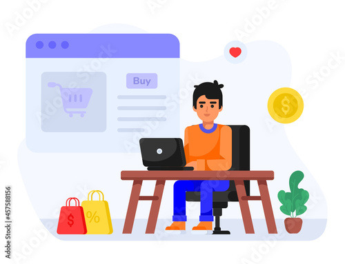 Человек в наушниках выбирает подкаст на портативном компьютере, чтобы начать просмотр и прослушивание, плоская векторная иллюстрация. Подкастинг, концепция мультимедийного контента.