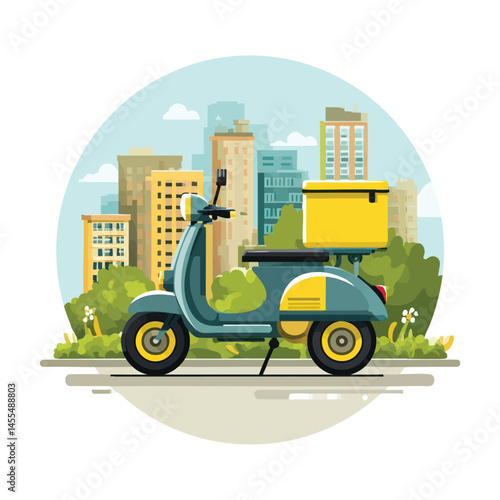 Мужчина в шлеме ведет скутер по городской улице. Векторный плакат концепции городского транспорта. Доставка по городу на мопеде.