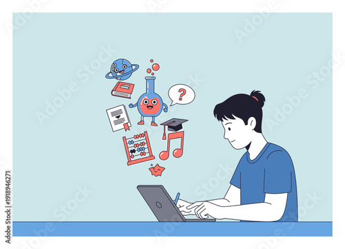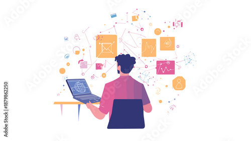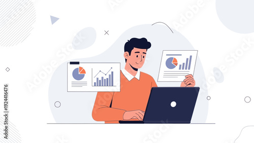 Молодой человек делает покупки онлайн с помощью портативного компьютера, плоская векторная иллюстрация. Персонаж мужского пола, совершающий покупки онлайн. Интернет-магазин, электронная коммерция.