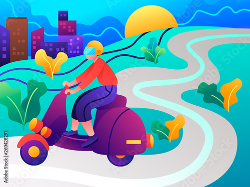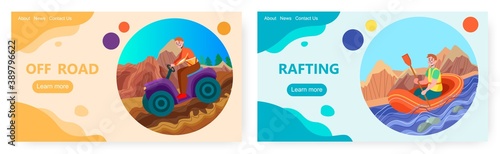 Человек на квадроцикле едет по бездорожью. Иллюстрация векторной концепции экстремального спорта и приключений. Человек сплавляется один по горной реке. Шаблон дизайна веб-сайта.