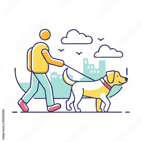 Мужчина убирает за собакой вектор. Иллюстрация мужского персонажа, собирающего собачьи какашки в перчатках. Владелец домашнего животного выгуливает щенка на поводке, изолированного на белом фоне