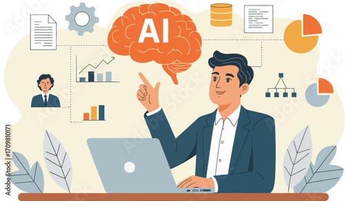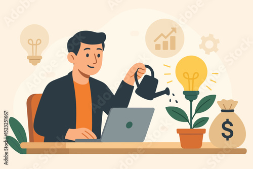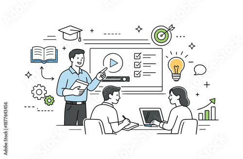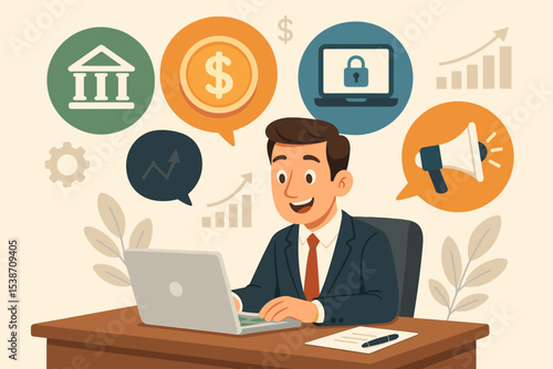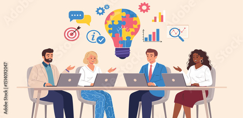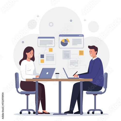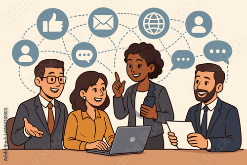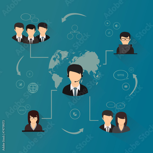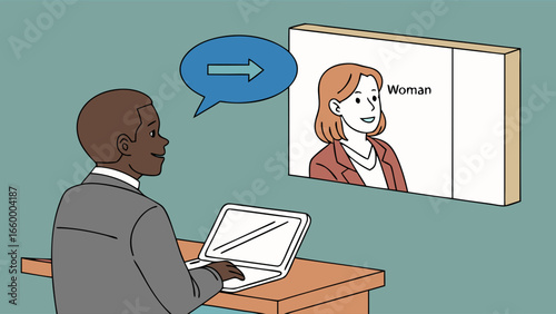 Человек удаленно работает с разными людьми, используя онлайн-общение. Векторная иллюстрация концепции витруальной бизнес-команды. Видеозвонок, удаленная работа, виртуальное общение, онлайн-работа.