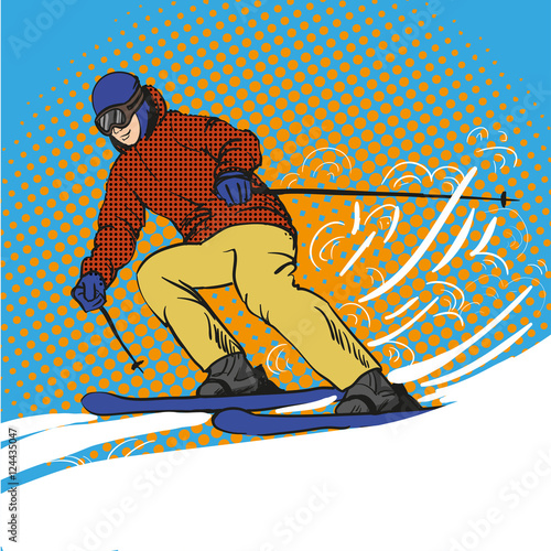 Мужчина-лыжник катается на лыжах в горах. Векторная иллюстрация в стиле ретро поп-арта. Концепция зимних спортивных каникул.