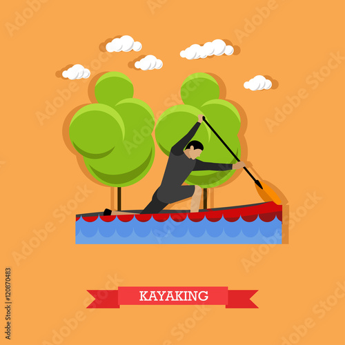 Мужчина плывет на байдарке с веслом. Спортсмен по гребле на байдарках. Активный образ жизни. Векторная иллюстрация в плоском дизайне