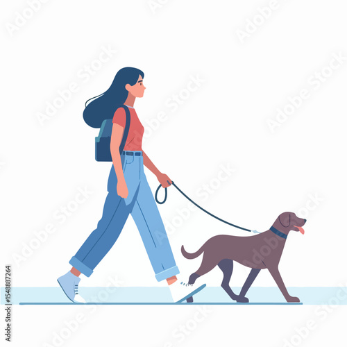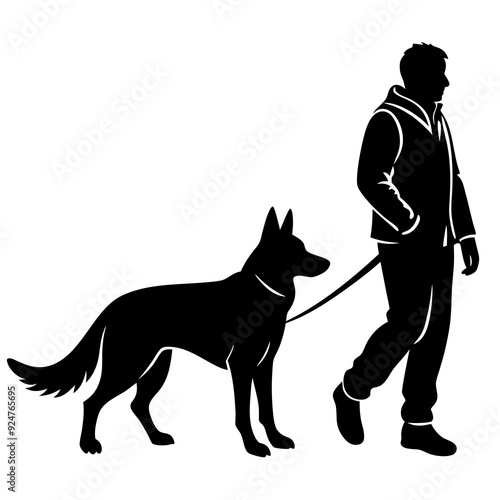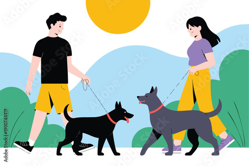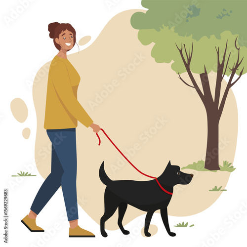 Уборка после векторной иллюстрации собаки. Мужчина выбрасывает собачьи какашки в пакете в мусорное ведро. Персонаж мужского пола прогуливается с доберманом на поводке. Окружающая среда экологическая чистота и забота о домашнем животном