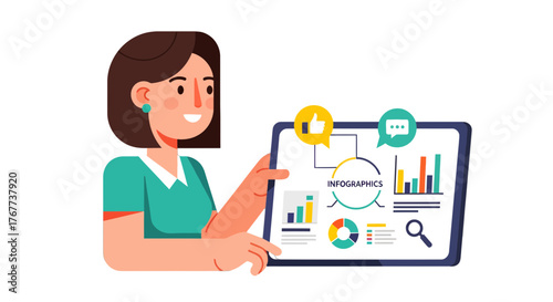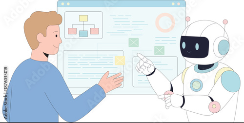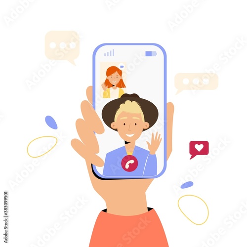 Мужчина-пользователь рекламирует смартфон в модном мессенджере, представляя новое приложение для общения с друзьями в векторной иллюстрации