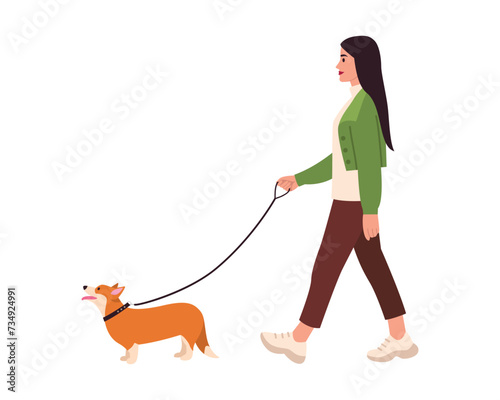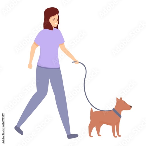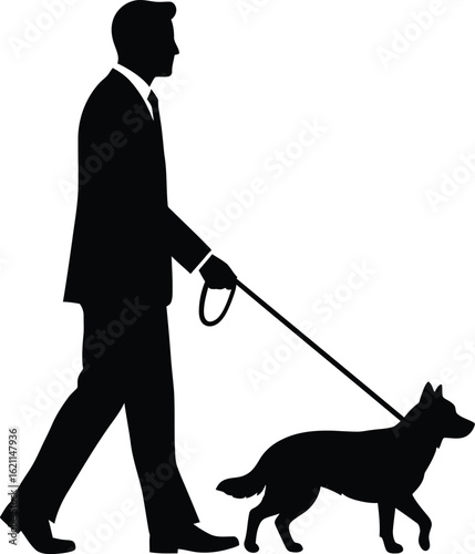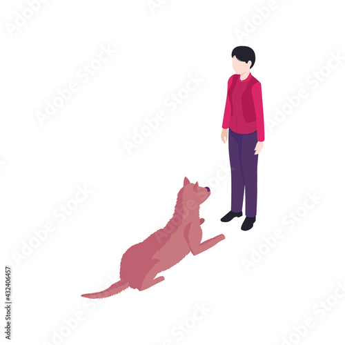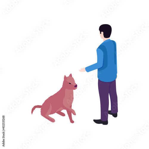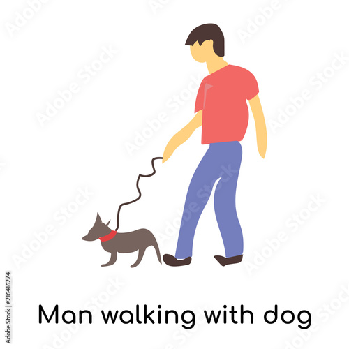 Мужчина, выгуливающий собаку на поводке. Значок любителя домашних животных. Щенок владельца, выделенный на белом фоне