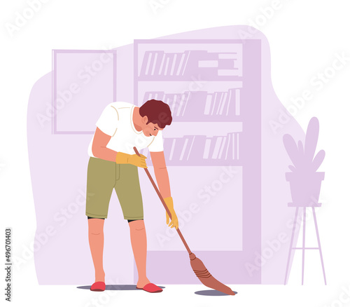 Мужчина моет пол шваброй, плоская векторная иллюстрация. Работа по дому, уборка дома, ведение домашнего хозяйства, домашние хлопоты.