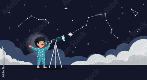 Молодой человек смотрит в телескоп на ночное небо, стоя на крыше дома. Векторная иллюстрация в плоском стиле. Элемент дизайна концепции увлечения астрономией.