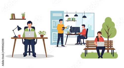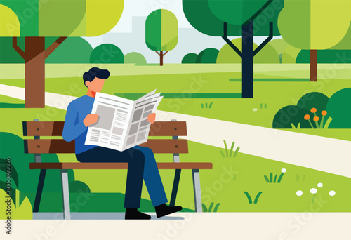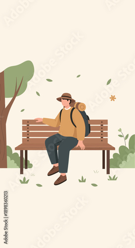 Человек с ноутбуком, работающий в парке векторная иллюстрация. Молодой парень сидит на скамейке, используя компьютер для внештатной работы, удаленной работы над пейзажем общественного сада. Студент, рабочий или турист с ПК