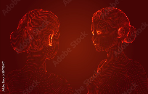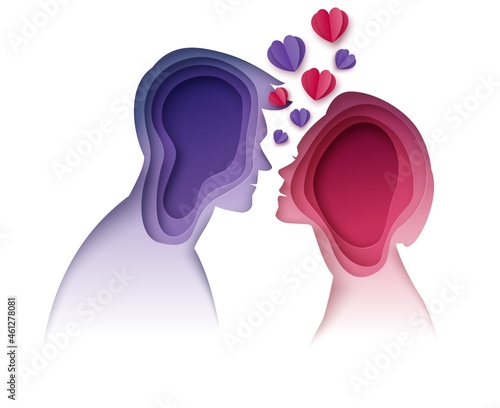 Силуэты мужчины и женщины, смотрящие друг на друга, векторная иллюстрация в стиле бумажного искусства. Пара влюбленных. Романтические отношения, любовь, страсть.