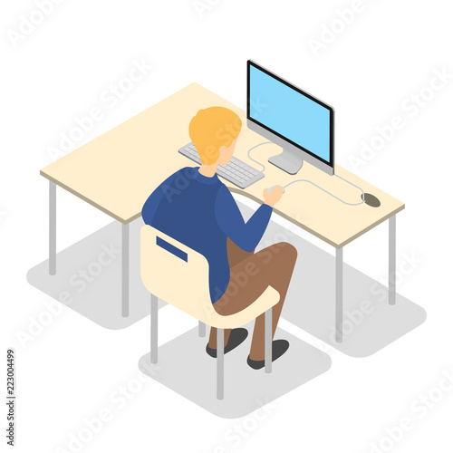Мужчина, работающий за компьютером в векторе. Значок удаленной работы. Дизайнер-фрилансер, бизнесмен на рабочем месте, выделенный на белом фоне