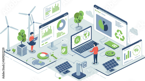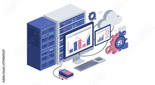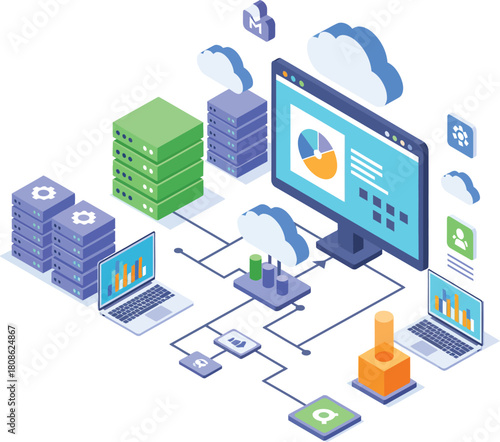 Бизнесмен, работающий на ноутбуке с использованием облачной системы, плоская векторная изометрическая иллюстрация. Хранение данных, технологии облачных вычислений.
