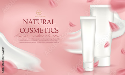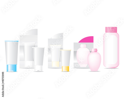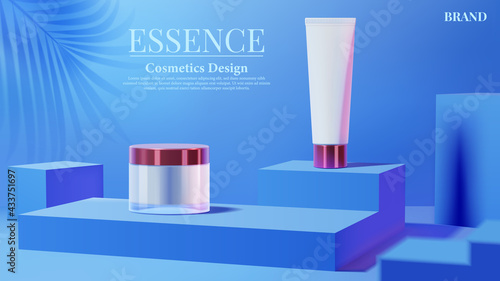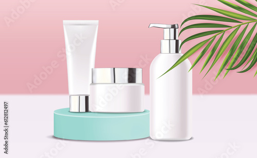 Шаблон рекламы морской косметики, векторная иллюстрация. Набор макетов белых пустых косметических флаконов, фон подводного мира в стиле поделок из бумаги. Средства для красоты и ухода за кожей.