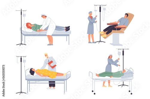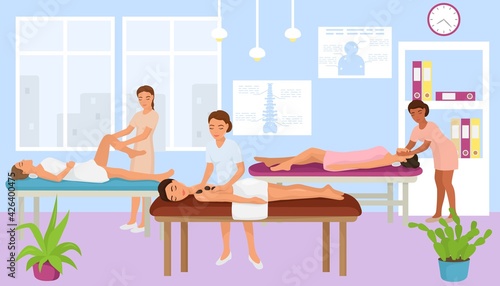 Набор композиций для массажной терапии, векторная плоская изолированная иллюстрация. Люди, получающие и делающие расслабляющий, целебный массаж тела женщинам, малышам. Лечение для уменьшения стресса, боли и мышечного напряжения.