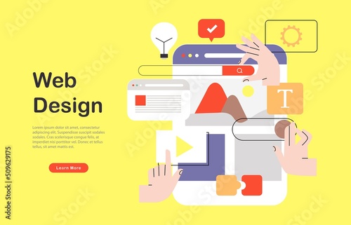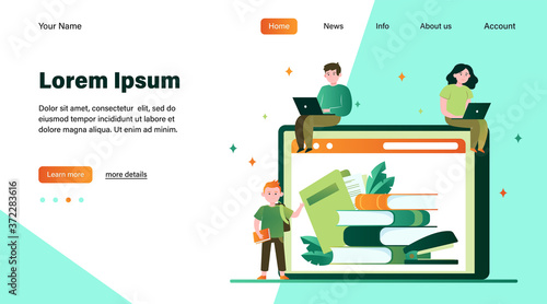 Векторный шаблон целевой страницы библиотеки медиа-книг. Люди читают, покупают, выбирают бумажные и электронные книги для изучения в электронной библиотеке в школе иллюстрации. Онлайн-архив электронного обучения или книжный магазин