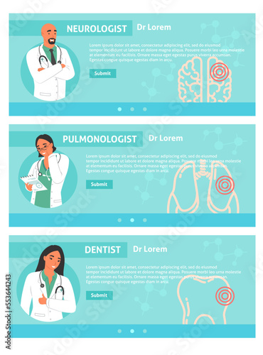 Набор заголовков веб-сайта онлайн-сервиса медицинского обслуживания и векторных баннеров. Иллюстрация отделения невролога, пульмонолога и стоматолога клиники. Концепция дистанционной медицины и телемедицины