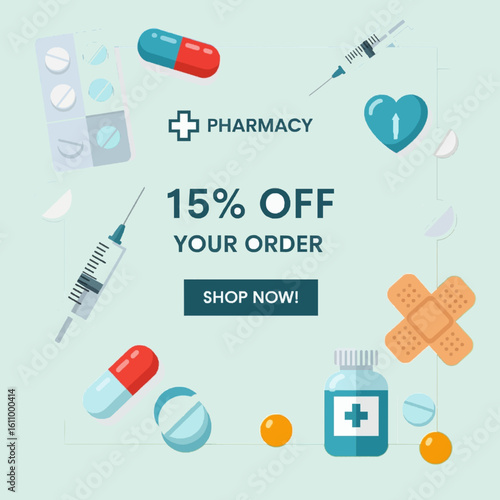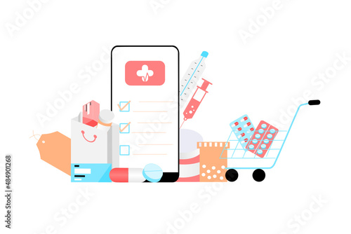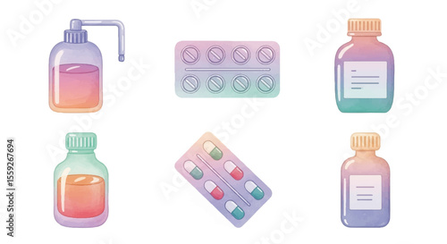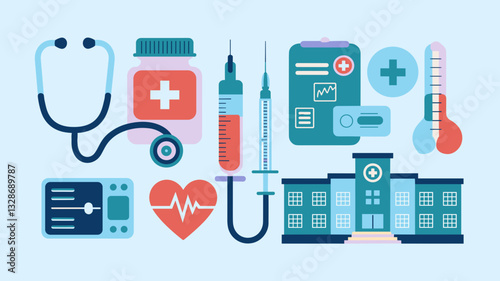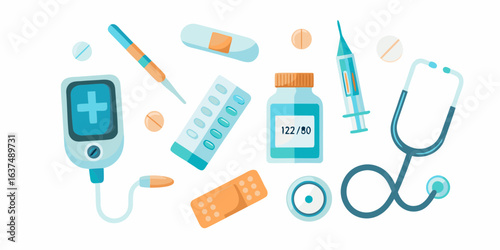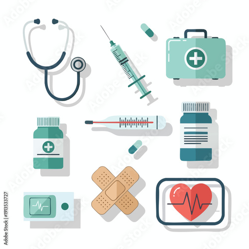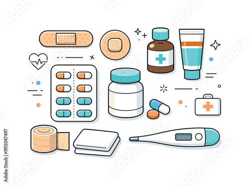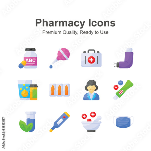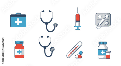 Векторная иконка медицины. Символ изолированного медицинского средства и аптечки первой помощи. Флакон с таблетками и фармацевтическими препаратами для таблетирования, шприц, капли, лейкопластырь, приложение для мобильного телефона, коробка доктора