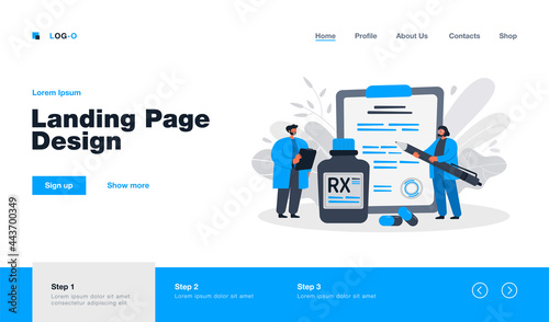 Шаблон целевой страницы для медицины. Векторная концепция дизайна в плоском стиле для медицинского веб-сайта, разработка мобильного сайта. Аптечка первой помощи, удостоверение врача, медицинский рецепт, стетоскоп, шприц, пузырек с таблетками.
