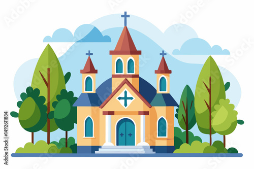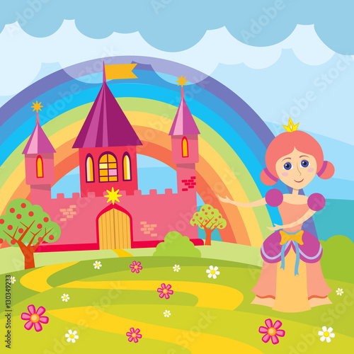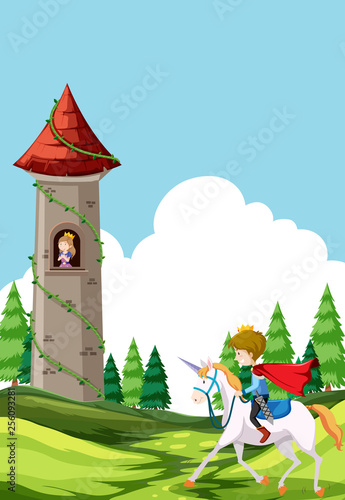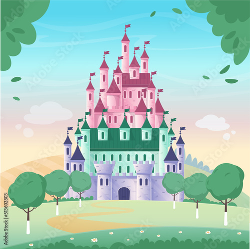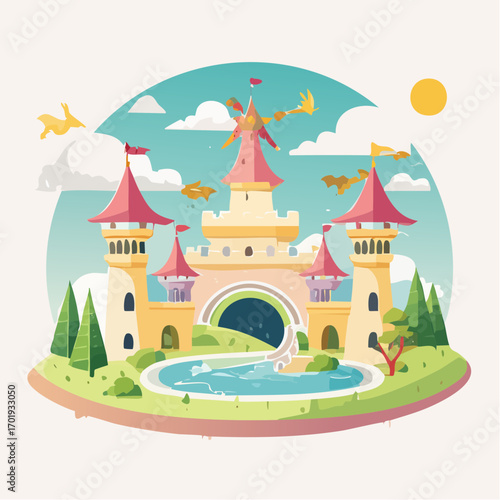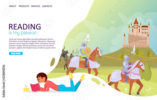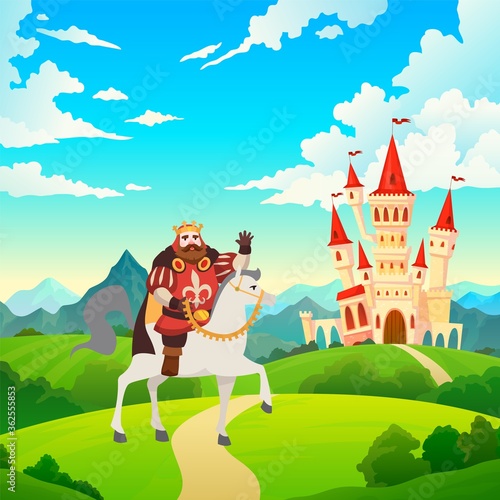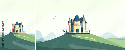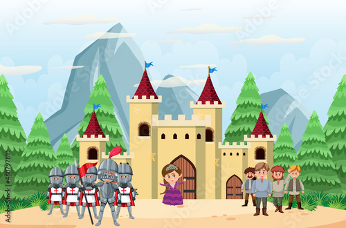 Средневековая сцена с рыцарями в доспехах на лошадях с копьями, приближающимися к замку, стоящему на холме. Векторная иллюстрация дизайна в плоском стиле.