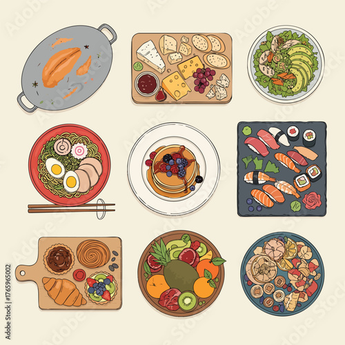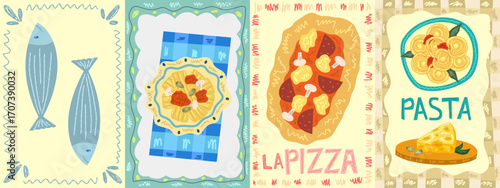 Средиземноморская еда с рыбой, салатом и овощами. Женщина готовит здоровую еду из свежих ингредиентов. Векторный набор рисованных иллюстраций и плакатов.