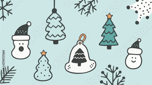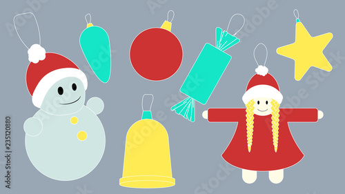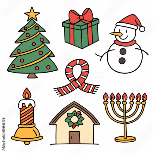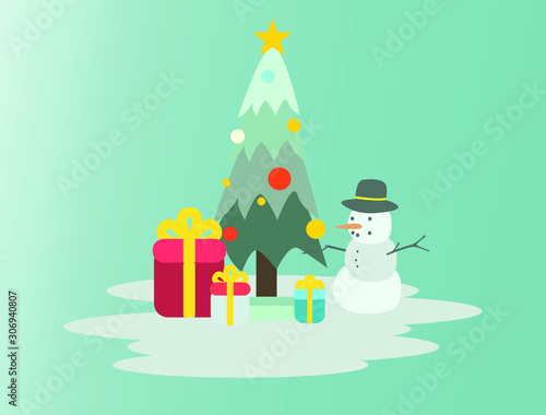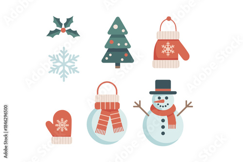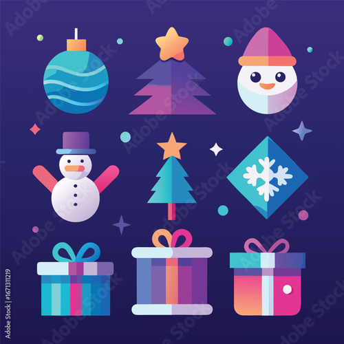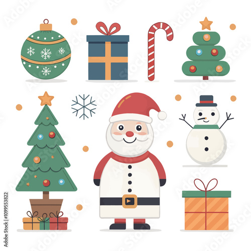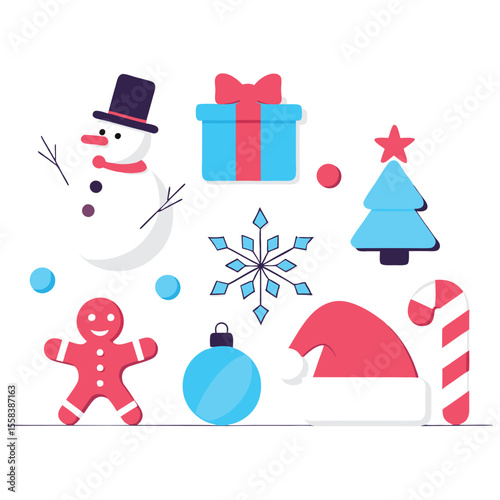 Счастливого Рождества и счастливого празднования нового 2023 года в 3d-векторе аксессуаров. Праздничный воздушный шар, коробка с подарком-сюрпризом, украшенная рождественская елка, голова Санта-Клауса, снеговик и набор леденцовых тросточек.