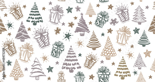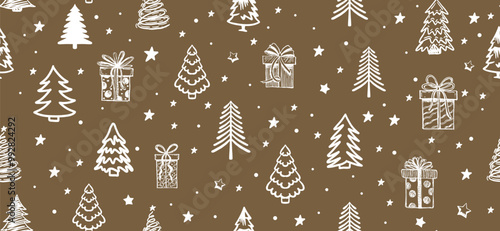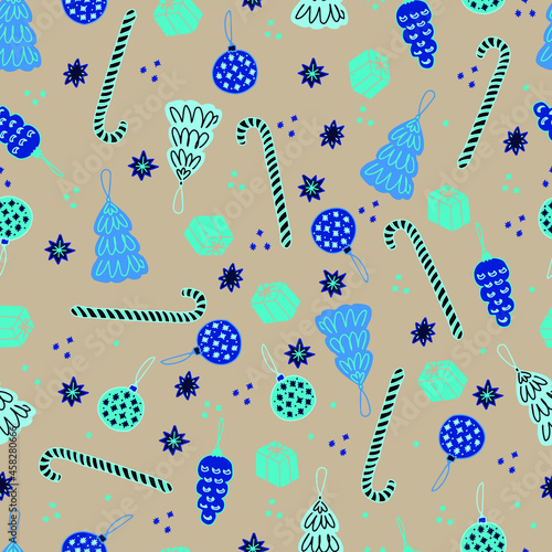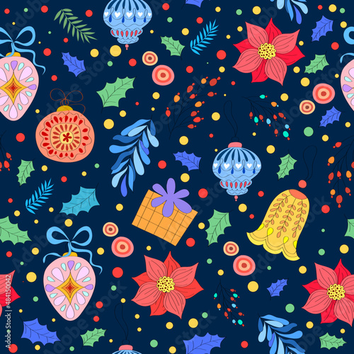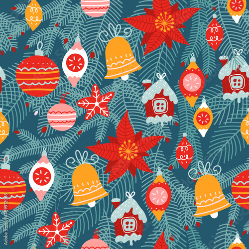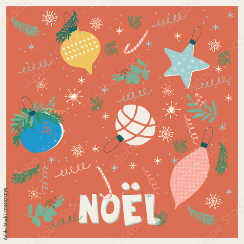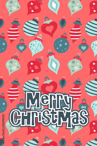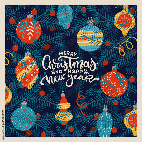Счастливого Рождества и счастливого нового года поздравительная открытка и фоновый шаблон. Зимний праздник векторная иллюстрация в винтажном стиле. Елка и игрушки. 2021 новый год рисованный плакат.