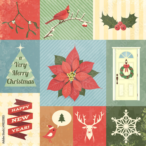 Шаблон поздравительных открыток с Рождеством и Новым годом. Векторный набор иллюстраций зимних праздников в винтажном стиле. Рождественская елка и игрушки. новогодние плакаты 2022 года, нарисованные от руки.