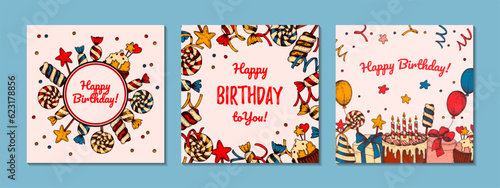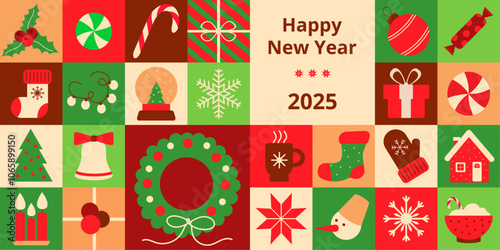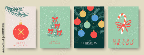 Шаблон поздравительных открыток с Рождеством и Новым годом. Векторный набор иллюстраций зимних праздников в винтажном стиле. Рождественская елка и игрушки. нарисованный от руки плакат на новый год 2023 года.