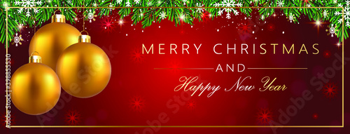 Векторный шаблон поздравительной открытки с Рождеством и Новым годом. Вырезанные из бумаги ветки рождественской елки обрамляют шарами, чулками, подарочными коробками.
