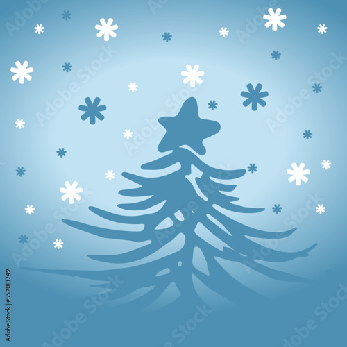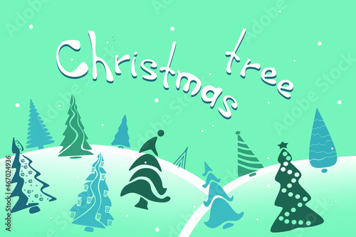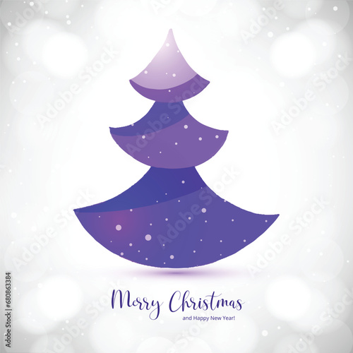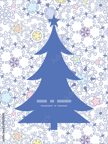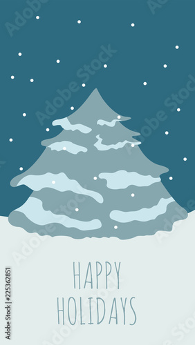 Векторный шаблон поздравительной открытки с Рождеством Христовым. Рождественская елка в стиле многослойной вырезки из бумаги с пейзажем зимнего ночного леса, силуэтами семьи оленей внутри, снежинками и надписью от руки "Счастливого Рождества".