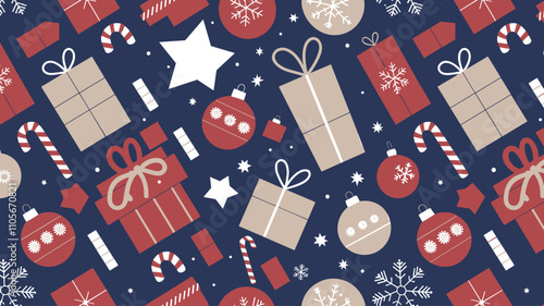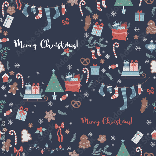 Фоновый шаблон и баннер с Рождеством и новым годом. Векторная иллюстрация зимнего праздника в винтажном стиле. Рождественская елка и игрушки. новогодняя открытка, нарисованная от руки на 2023 год.