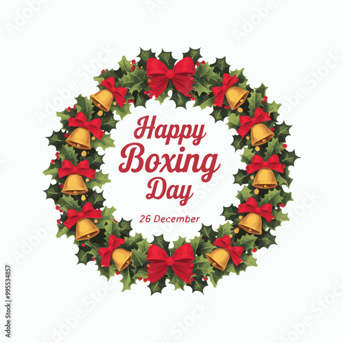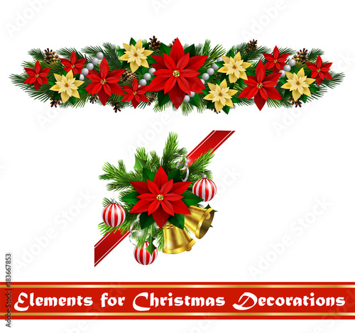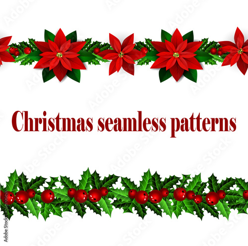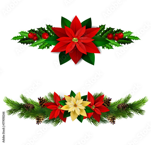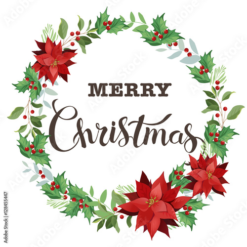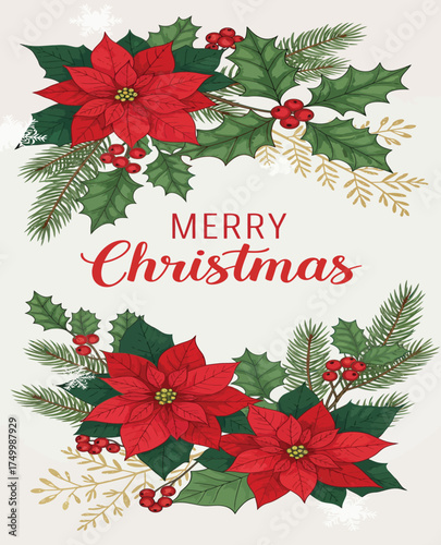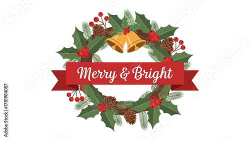 Векторный шаблон поздравительной открытки с Рождеством Христовым. Вырезанные из бумаги рождественские колокольчики с бантом, гирлянда из зеленых еловых веток, листьев остролиста и красных цветов.