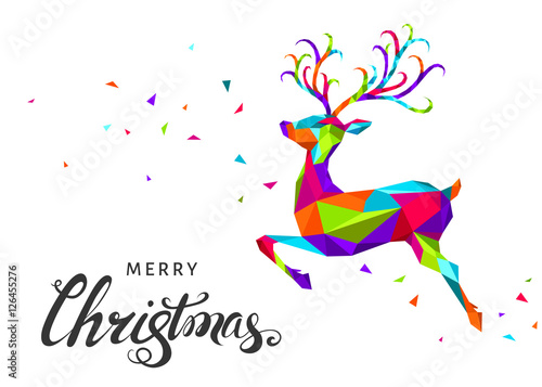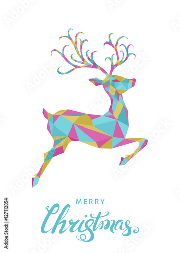 Векторный шаблон поздравительной открытки с Рождеством Христовым. Вырезанные из слоистой бумаги красочные силуэты оленей, снежинки и надписи от руки "С Рождеством".