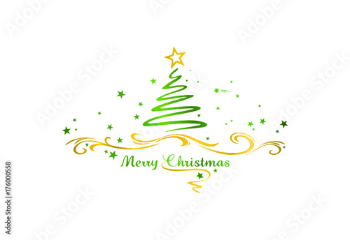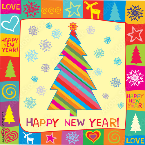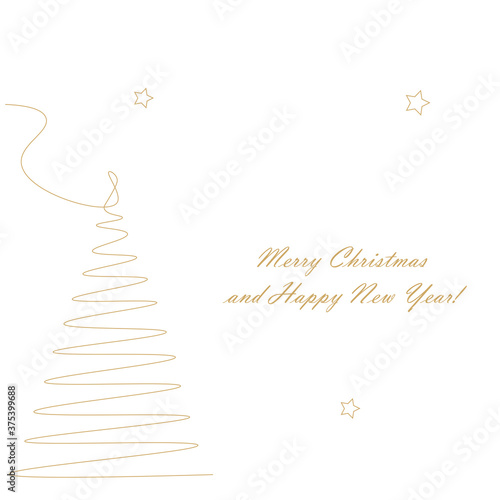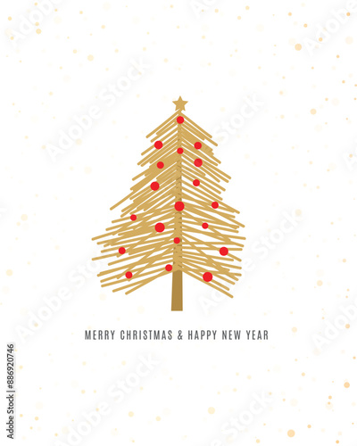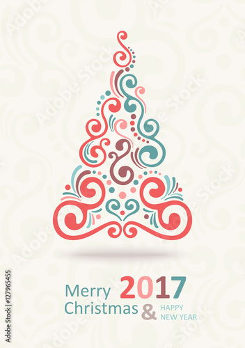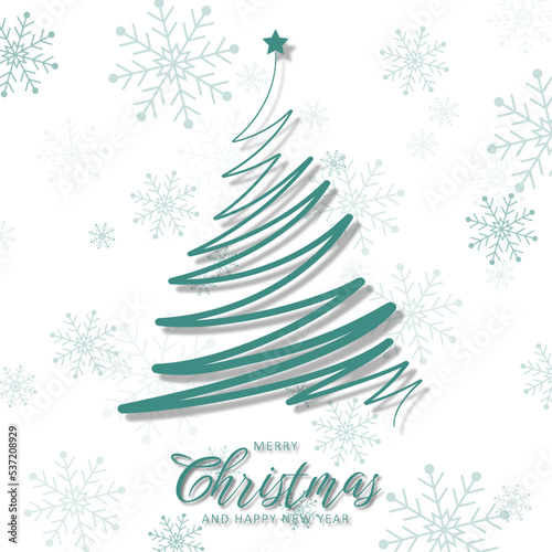 Векторный шаблон поздравительной открытки с Рождеством Христовым. Вырезанный из многослойной бумаги красочный силуэт рождественской елки, снежинки и надпись от руки "С Рождеством".