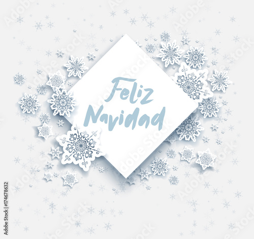 Шаблон поздравительной открытки с Рождеством и Новым годом, векторная иллюстрация в современном стиле бумажного искусства. Декоративная рамка с вырезанными из бумаги снежинками и зимним пейзажем горного леса.
