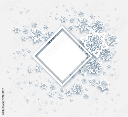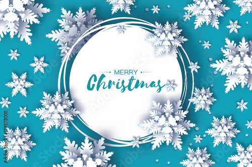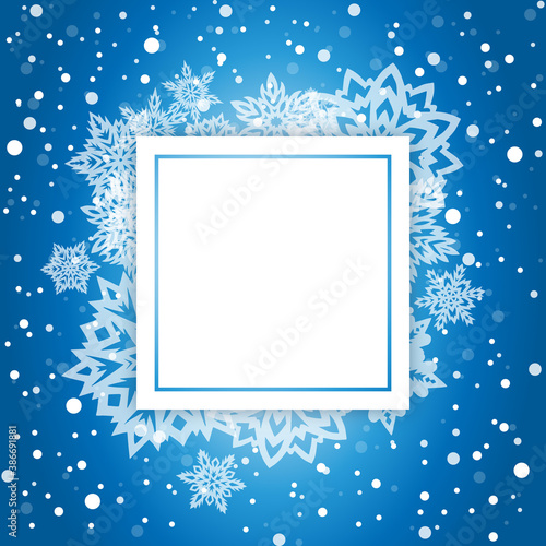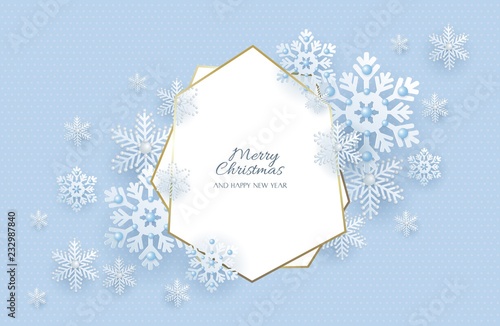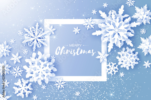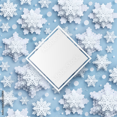 Шаблон дизайна векторного плаката с Рождеством и Новым годом. Декоративная рамка с вырезанными из бумаги снежинками и скопированным пространством. Фон рождественских и новогодних праздников.