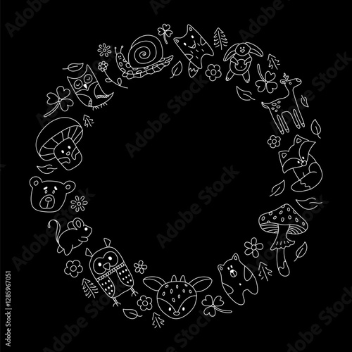 Счастливого Рождества круглая рамка на векторной иллюстрации классной доски. Веселый праздничный фон со сладкими кондитерскими изделиями и художественным оформлением горячих напитков. Праздничный графический эскиз в стиле гранж