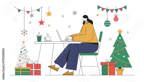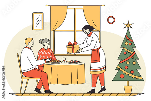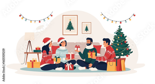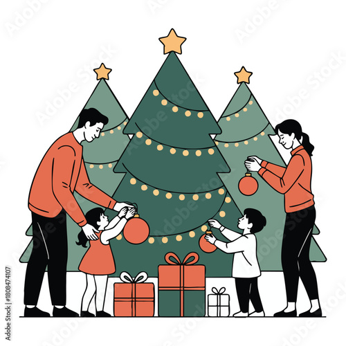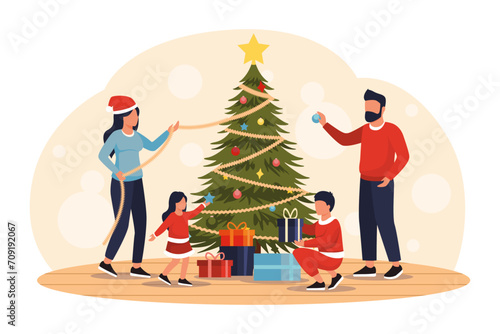 Веселая рождественская сцена. Счастливая пара украшает рождественскую елку и весело проводит время дома, плоская векторная иллюстрация. Муж украшает свою жену гирляндой. с Новым Годом. Празднование зимних праздников.