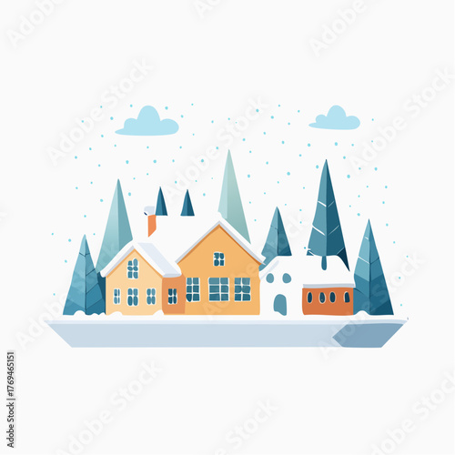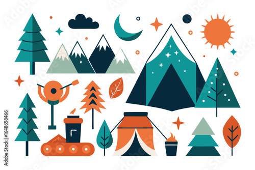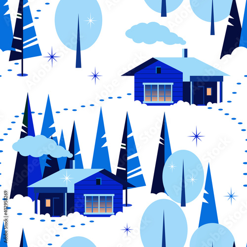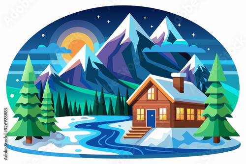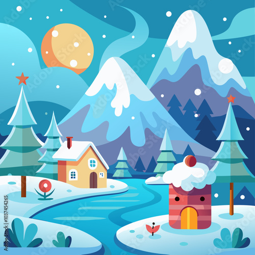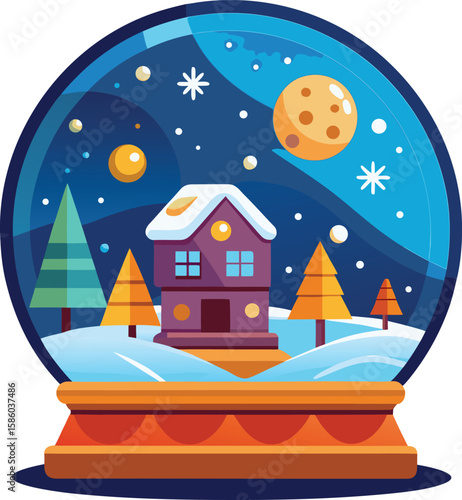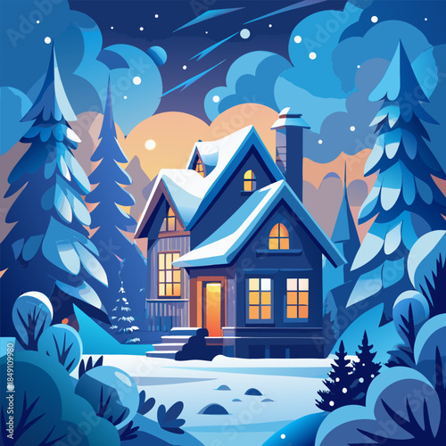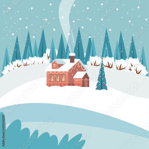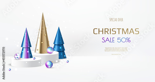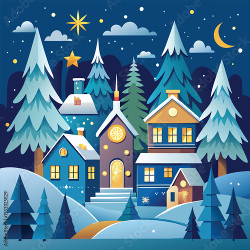 Веселая рождественская сцена, векторная иллюстрация в стиле бумажного искусства. Украшенная рождественская елка с шарами, фонарем, зимний ночной лесной пейзаж.