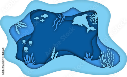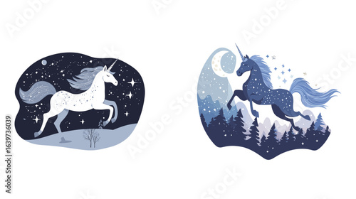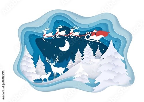 Санта едет на санях с северными оленями, зимний пейзаж, векторная иллюстрация в современном стиле бумажного искусства. Веселого Рождества, счастливого Нового года композиция для поздравительной открытки, плаката, баннера.