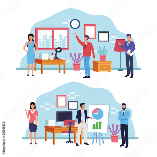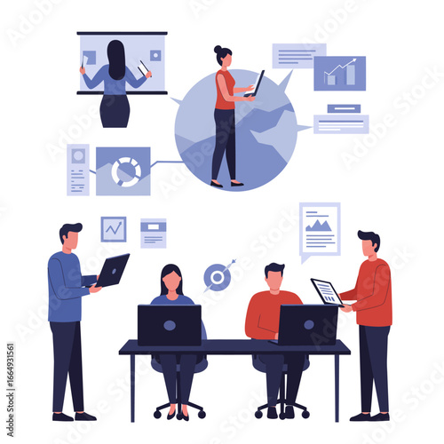 Вектор метавселенной. Бизнес-команда, носящая гарнитуру vr goggle, проводит виртуальное обучающее совещание, анализируя финансовый график и графический отчет
