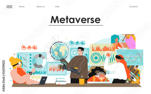 Плоская целевая страница метавселенной. Мужчина и женщина в гарнитуре виртуальной реальности используют киберпространство для работы, игры, изучения науки векторный шаблон. Виртуальная реальность и технология блокчейн
