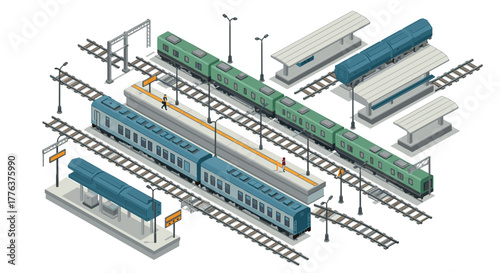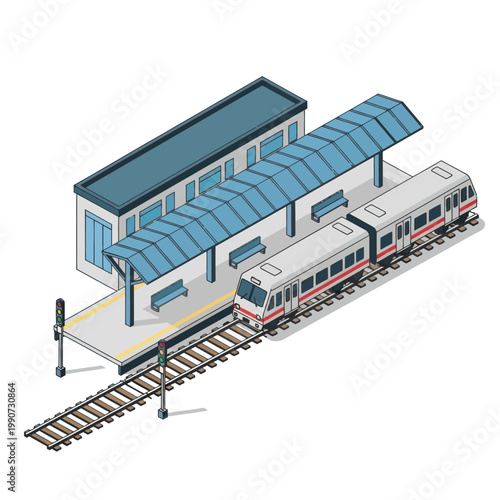 Вектор железнодорожной станции метро. Платформа метро представляет собой изометрическую железную дорогу в интерьере городского подземного туннеля с 3d-эскалатором, рельсами, вагоном и рекламным щитом
