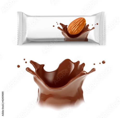 Реалистичный векторный рисунок кусочка шоколада с миндалем и брызгами молока. Элемент дизайна бренда сладких десертов, выделенный на белом фоне