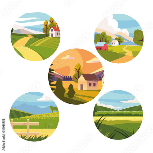 Векторная иллюстрация концепции молочной фермы в современном стиле бумажного искусства. Сельский пейзаж, корова, трактор, ферма по кругу. Реклама бизнеса по разведению молочных продуктов, шаблон дизайна упаковки молочных продуктов.