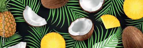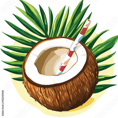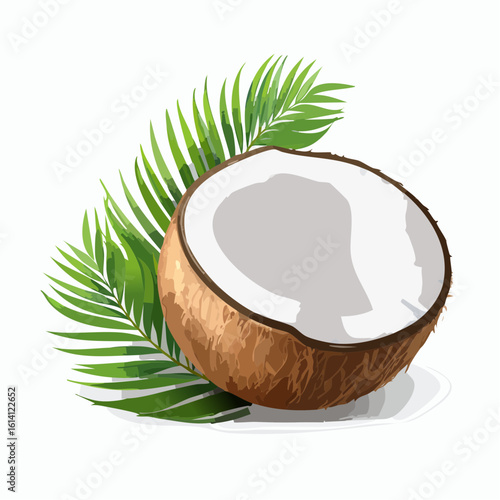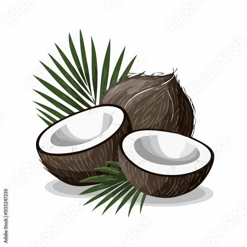 Брызги молочного коктейля и плоды кокоса на фоне зеленых пальмовых листьев - реалистичная векторная иконка. Элемент дизайна для сладких продуктов, выделенный на белом фоне