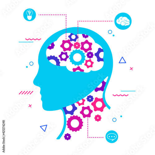 Силуэт головы человека с шестеренками, зубчатыми колесами и лампочкой, векторная иллюстрация в стиле бумажного искусства. Психология, человеческий разум, сила мозга, концепция новой идеи для веб-баннера, страницы веб-сайта и т.д.