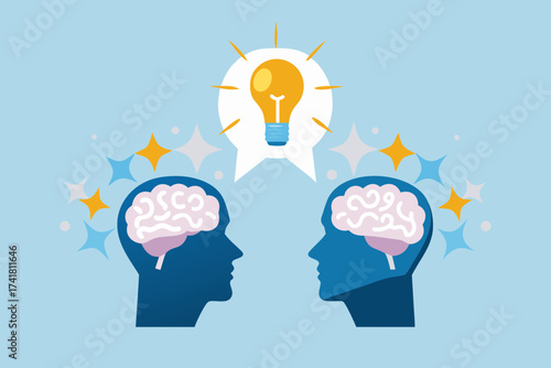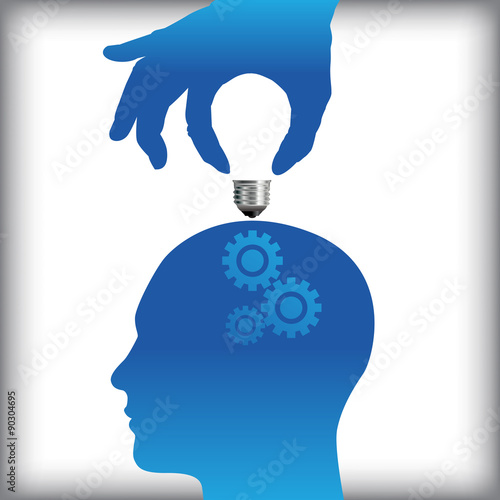 Бизнесмен, поднимающийся по лестнице человеческой головы, ведущей к мозгу с шестеренками, зубчатыми колесами в конце, векторная иллюстрация в стиле многослойной вырезки из бумаги. Мысленный поиск, концепция мышления для плаката, баннера и т.д.