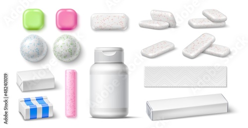 Шаблон рекламы мятной жевательной резинки, векторная иллюстрация. Белый пустой блокнот и макет упаковки жевательной резинки, вырезанные из бумаги листья зеленой мяты, падающие жевательные резинки со вкусом мяты.
